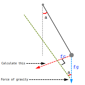 SIN(a) = force to calculate (fc) / force of gravity (fg); Thus fc = fg / SIN(a) This gives us the force (or acceleration) that acts on the pendulum. |